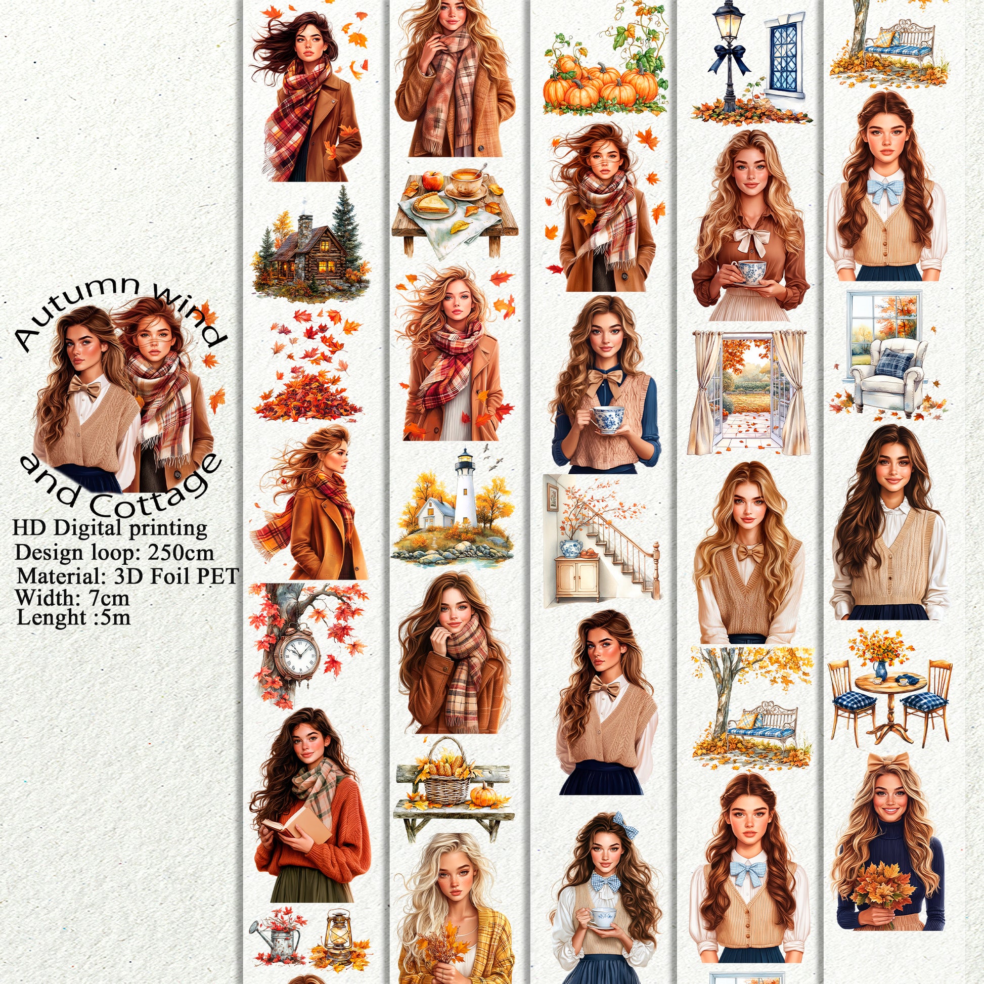 PET 3D raised Autumn wind and Cottage tape,one roll fashion, junk journal, scrapbooking,bullet journal, card making.