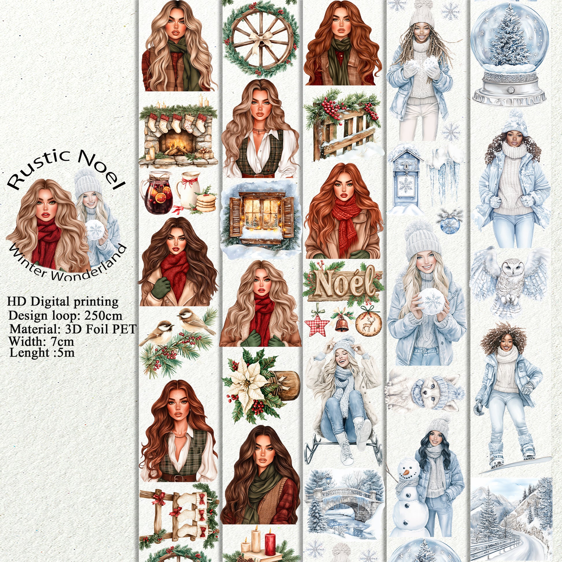 PET 3D raised Rustic Noel and Winter Wonderlandtape,one roll fashion, junk journal, scrapbooking,bullet journal, card making.